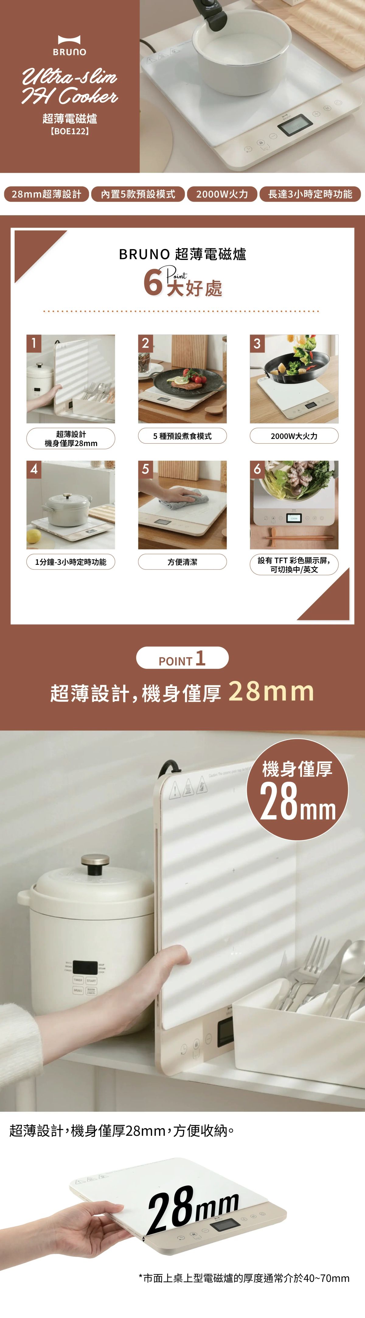 The BRUNO Ultra-Thin Induction Cooker is specially designed for modern households. Featuring an extremely slim body with a thickness of just 28 mm, it combines advanced induction heating technology with an intuitive TFT color display, allowing you to effortlessly master every dish with a refined cooking experience.