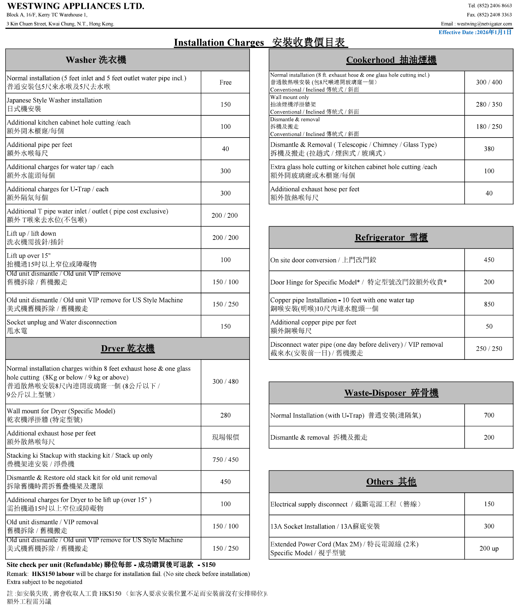 Installation & Delivery Service Charge Guide
