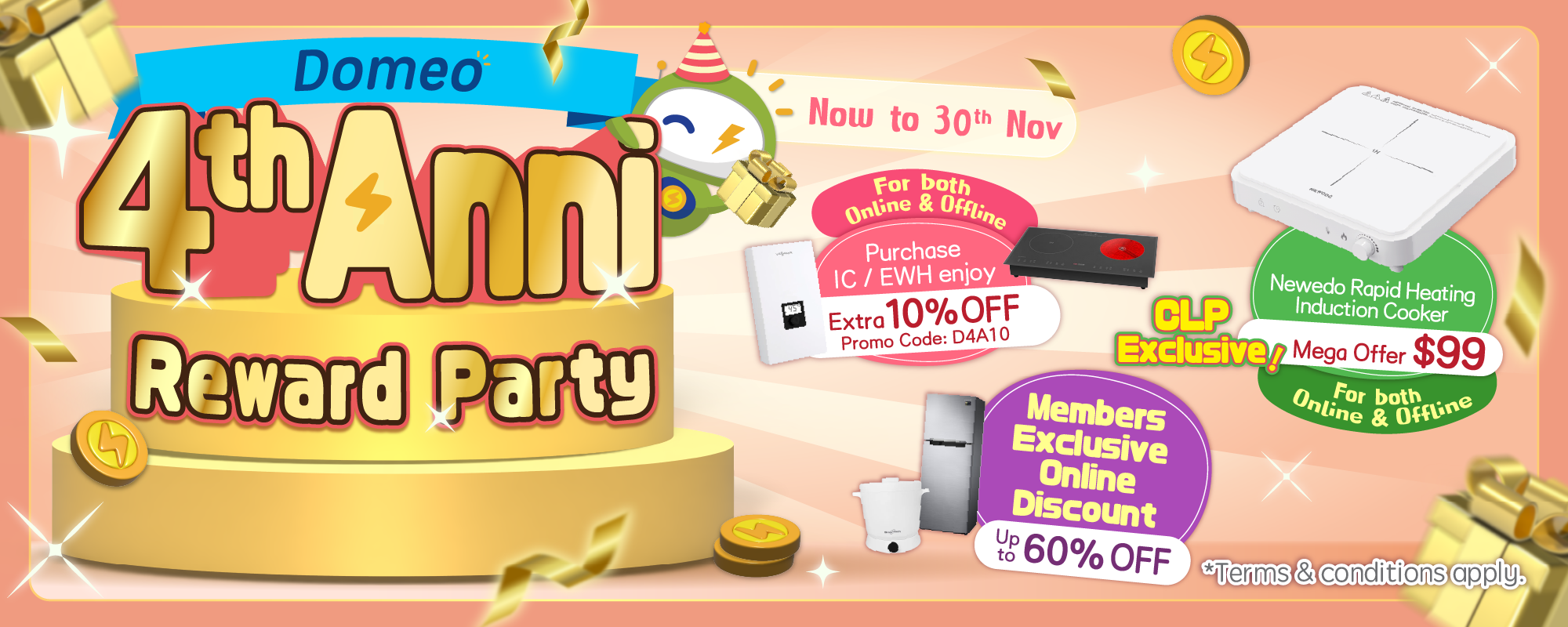 Crazy Reward Code: Extra 10% off on selected Induction Cooker (IC) or Electric Water Heater (EWH) (for both Domeo eShop and CLP Stores) with Discount Code: D4A10:
