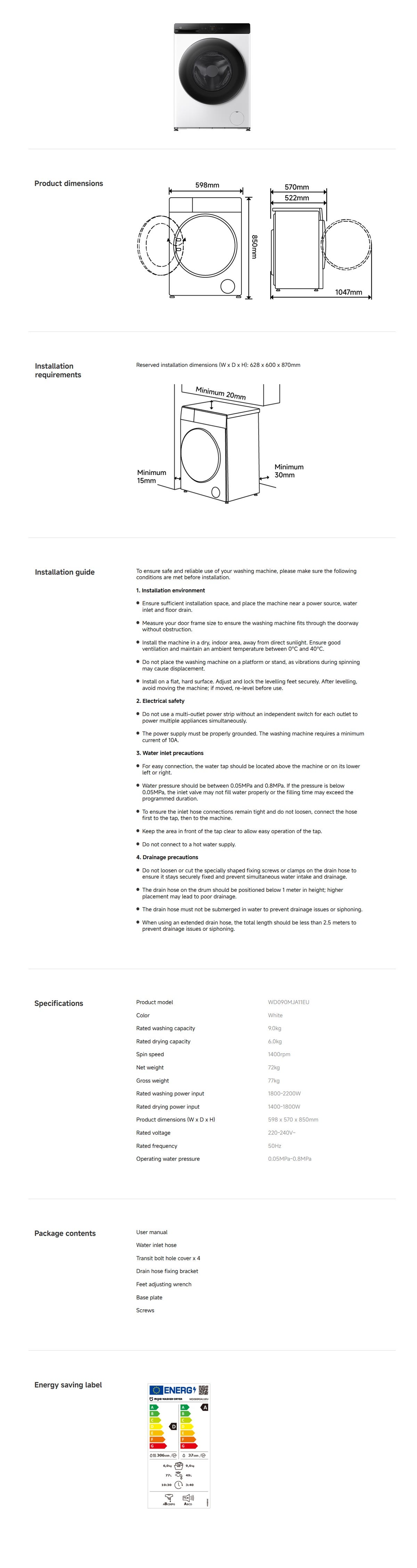 Rated Wash Power Input: 1800-2200W