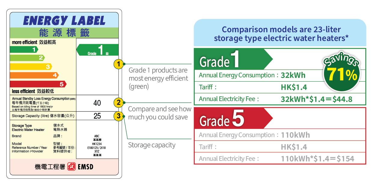* Comparison is based on model information listed on the EMSD's Mandatory Energy Efficiency Labelling Scheme website in May 2025. The comparison models are 23-liter storage type electric water heaters. The models are German Pool GPN-6E-V (Grade 1) and DEUTSCHOONER DNP-6.5S (Grade 5).
