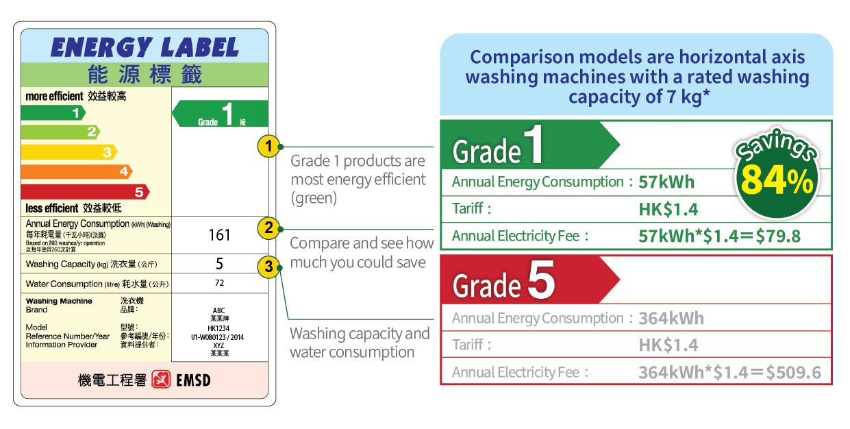 * Comparison is based on model information listed on the EMSD's Mandatory Energy Efficiency Labelling Scheme website in May 2025. The comparison models are horizontal axis washing machines with a rated washing capacity of 7 kg. The models are Rasonic RW-S127 (Grade 1) and Samsung WF0702WKE (Grade 5).