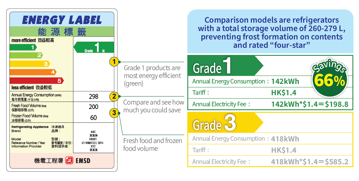 * Comparison is based on model information listed on the EMSD's Mandatory Energy Efficiency Labelling Scheme website in May 2025. The comparison models are refrigerators with a rated total storage volume of 260-279 L, which can prevent the formation of frost on contents and with a "four-star" frozen food compartment. The models are Smeg FAB28RCR4UK (Grade 1) and MITSUBISHI ELECTRIC MR-C41C-PWH-H (Grade 3).