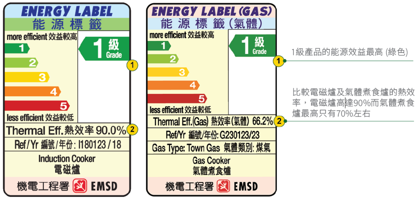 在能源效益方面,根據香港城市大學的研究,以相同的測試條件計算,使用電磁爐較氣體煮食爐,能源費用慳約40%! 能源標籤顯示,電磁爐的熱效率遠高於氣體煮食爐,有助縮短煮食時間,能源效益更高。